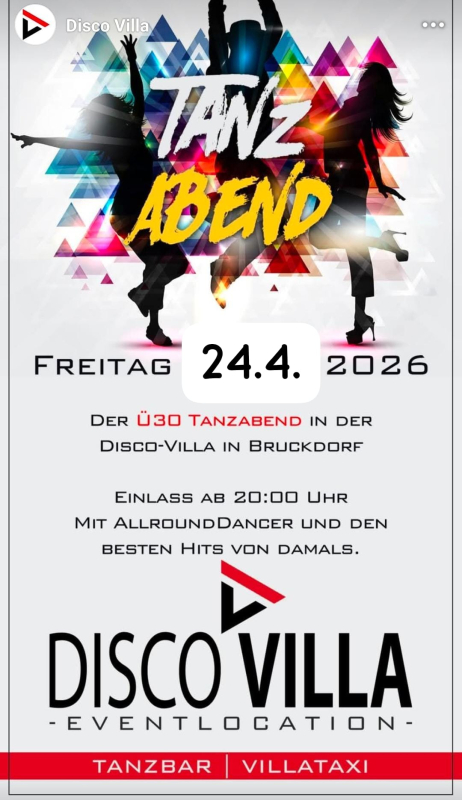 Disco Villa 24.4.2026 Freitag mit AllroundDancer Info +436644512100 Tanzpartner