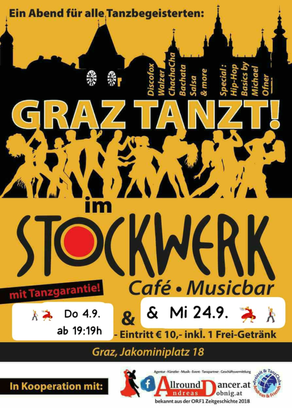 › Bilder › Stockwerk Graz Do 4.9. u. Mi 24.9. ab 19.19 GRAZ TANZT Tanzmusik mit HIP.HOP Animation 06644512100 Andreas Dobnig Tanzpartnerver