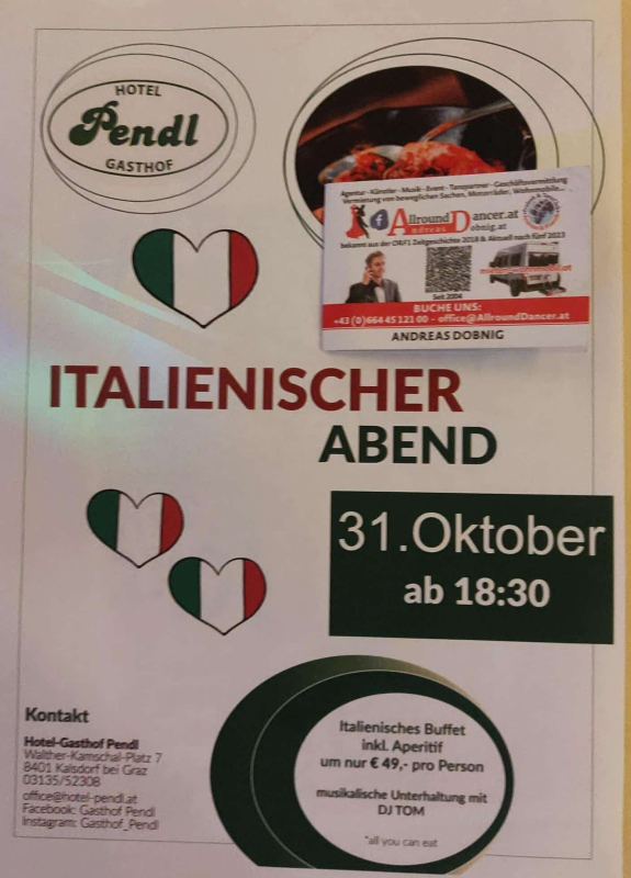 Gasthof Pendl 30.10.25 italienische Nacht mit Buffet und Dj Tom mit AllroundDancer Info 06644512100 Buche deinen Tanzpartner