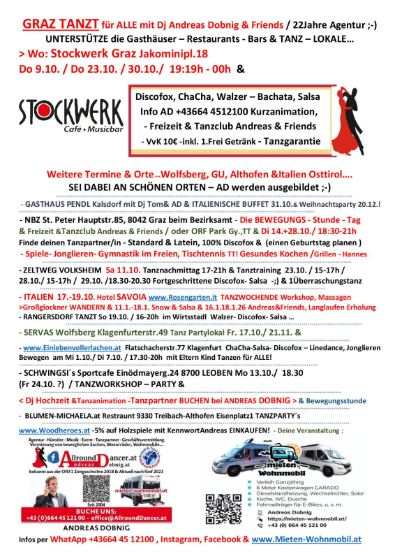 Klagenfurt 1.10.u Di 7.10. ab 17.30 Einlebenvollerlachen Info +436644512100 Graz Tanzt Italien Großglockner ALLE