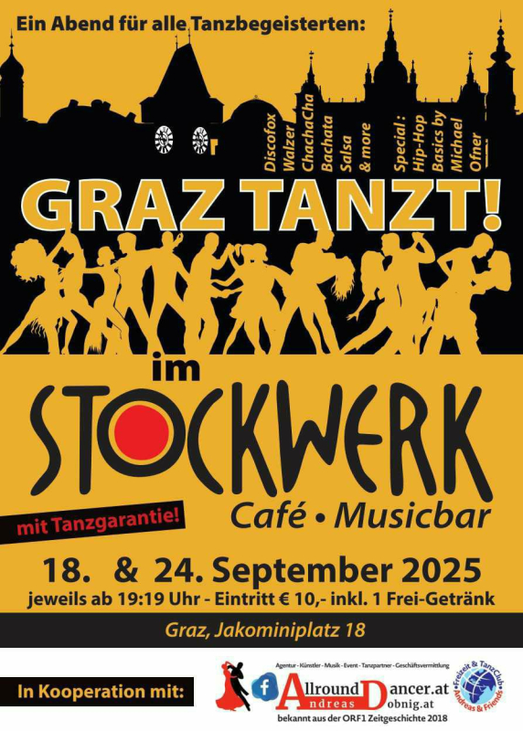 › Bilder › Stockwerk 18.9. u.24.9. u 9.10. ab 19:19h mit vielen Lokalen GRAZ TANZT Info 06644512100 Tanzabend für ALLE Salsa Discofox HIP .