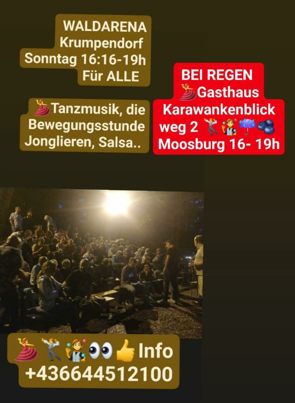 › Bilder › Waldarena Krumpendorf 27.7.um 16h Info +436644512100 Andreas Dobnig u.Friends Tanzabend Bewegungsstunden mit Jonglieren für ALLE